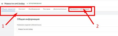 2) Заполняем все обязательные поля для добавления, в том числе грузим логотипы для светлого и темных тонов приложения Google News. Доходим до пункта "Проверка и публикация" (на рисунке мы указали отдельно под цифрой 2 данный пункт)